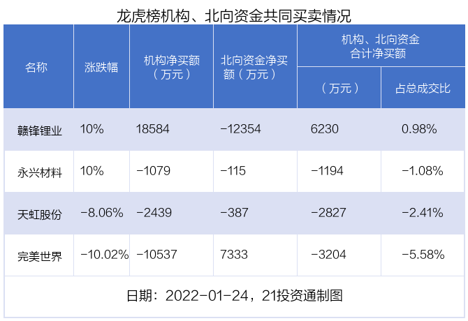 值得注意的是,机构和北向资金共同净卖出了永兴材料、天虹股份等2股;在完美世界,赣锋锂业上出现分歧,其中机构净买入赣锋锂业1.86亿元,北向资金净卖出1.24亿元。