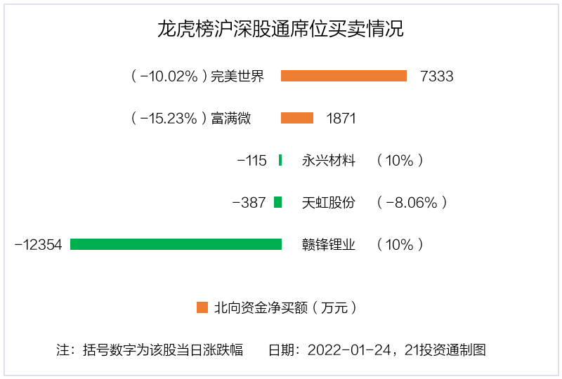 1月24日,北向资金参与龙虎榜中的个股共有5只,净买入2 股,净卖出3 股,合计净卖出3652.37万元,均为深股通。