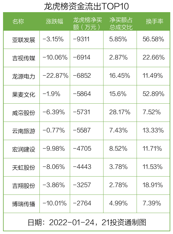 而龙虎榜中资金净流出最多的是亚联发展(002316.SZ),被净卖出为0.93亿元,占总成交金额的5.85%。亚联发展收盘下跌3.15%,换手率为56.58%。