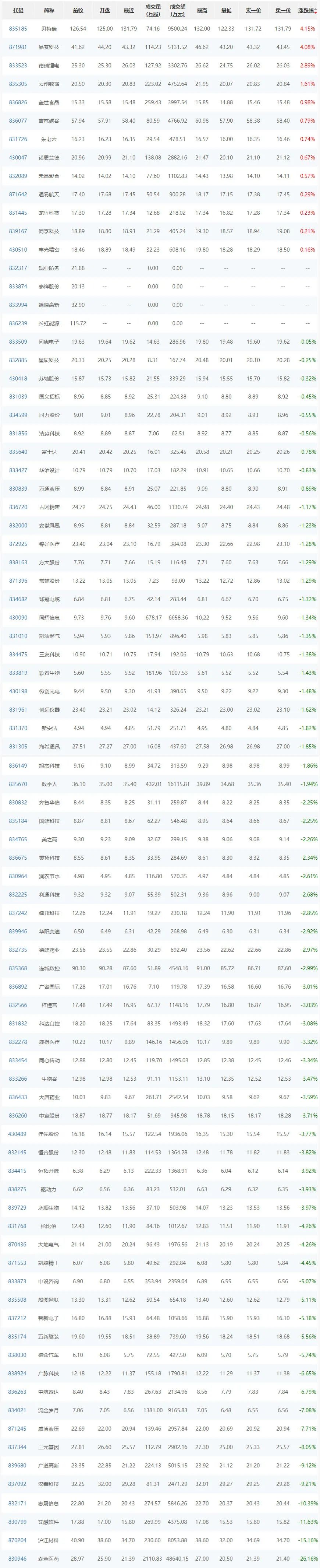其中,贝特瑞(835185)连续两日涨幅居首,上涨4.15%;晶赛科技(87981)涨幅居次,上涨4.08%;森萱医药(830946)跌幅居首,下跌26.16%;沪江材料(870204)跌幅居次,下跌15.16%。