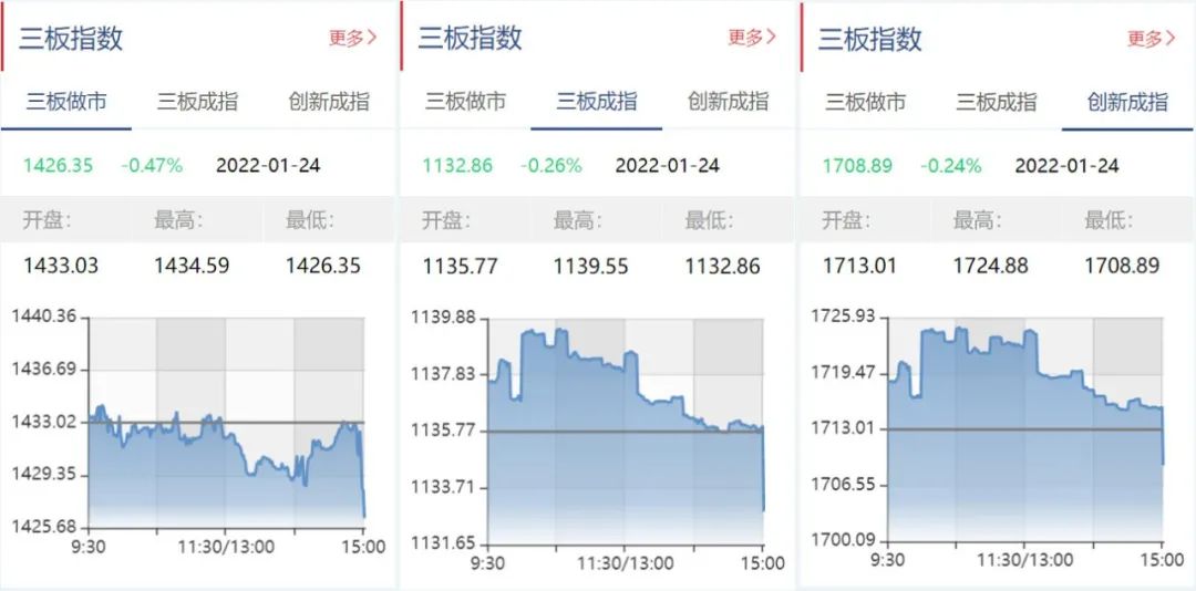 截至1月24日收盘,三板做市报1426.35点,下跌0.47%;三板成指报1132.86点,下跌0.26%;三板创新报1708.89点,下跌0.24%。