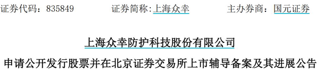 上海众幸公告显示,2022年1月21日,上海众幸与国元证券股份有限公司签署《上海众幸防护科技股份有限公司与国元证券股份有限公司之股票发行与上市辅导协议》,辅导机构为国元证券股份有限公司。