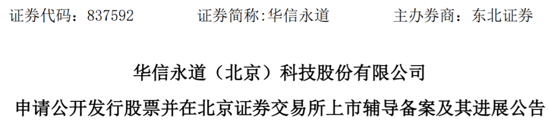 华信永道公告显示,公司于2022年1月19日与东北证券股份有限公司签订了《华信永道(北京)科技股份有限公司与东北证券股份有限公司关于华信永道(北京)科技股份有限公司拟向不特定合格投资者公开发行股票并在北京证券交易所上市之辅导协议》。