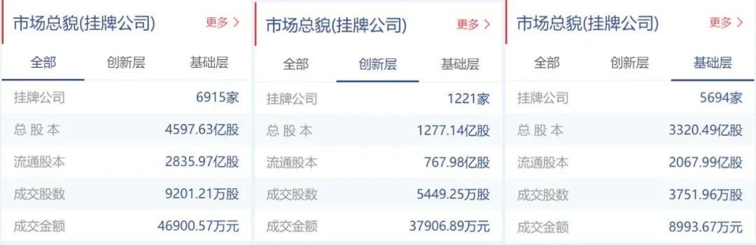 新三板挂牌公司总计6915(创新层1221家,基础层5694家),总股本4597.63亿股,流通股本2835.97亿股。