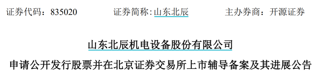 山东北辰公告显示,公司于2022年1月18日与开源证券股份有限公司签署了《山东北辰机电设备股份有限公司向不特定合格投资者公开发行股票并上市之辅导协议》。