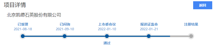 凯德石英是一家石英玻璃制品生产商,主要从事石英仪器、石英管道、石英舟等石英玻璃制品的研发、生产和销售。公司上市北交所的进展是,于2022年1月10日过会。