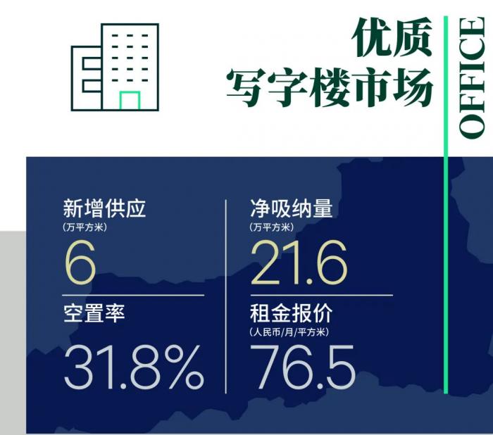 2021年,西安优质写字楼市场仅录得一栋6万平方米的乙级写字楼入市,推动市场总量上升至629万平方米。其中甲级办公楼体量不变,仍为163万平方米。纵观全年需求端,租赁活动主要集中在前三季度,全年86%的新设立租赁交易集中在前三季度达成,其中三季度占比高达40%。同时,企业抓住在线教育行业“震荡”带来的机会窗口,积极升级、扩租办公空间,超过60%的升级扩租需求集中在在线教育公司集中退租的三四季度。全年西安优质写字楼净吸纳量录得约21.6万平方米,市场整体空置率同比下降2.8个百分点至31.8%;全年租金呈下行趋势,可比项目租金同比下降0.3%至每月每平方米76.5元。