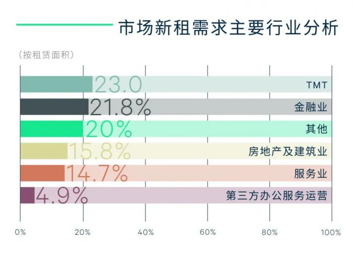 楼宇经济聚集效应凸显,主导产业展现需求韧性。分需求行业来看,TMT(科技新媒体)、金融业、房地产建筑业以及专业服务业需求仍具韧性,分别占比23.0%、21.8%、15.8%及14.7%,持续支撑写字楼市场去化。其中金融业占比较去年显著增长,上升6.2个百分点。疫情爆发令大众对寿险及健康险等险种的关注显著提升,加之宏观环境不明确下大众理财意识不断增强,金融业迎来发展红利。其中,高新区的优质写字楼承接了96%的金融类企业升级需求,优质楼宇聚集带来的产业聚集效应明显。同时,营商环境的持续改善吸引更多金融机构落户西安,市场录得多宗如保险、证券等传统金融类企业大面积新设立案例,推动金融行业新设立占比接近50%。此外,金融机构的持续进驻及宏观环境的波动也为法律服务、不良资产收购、企业服务外包等行业的发展创造了契机,刺激专业服务业的租赁活跃度。