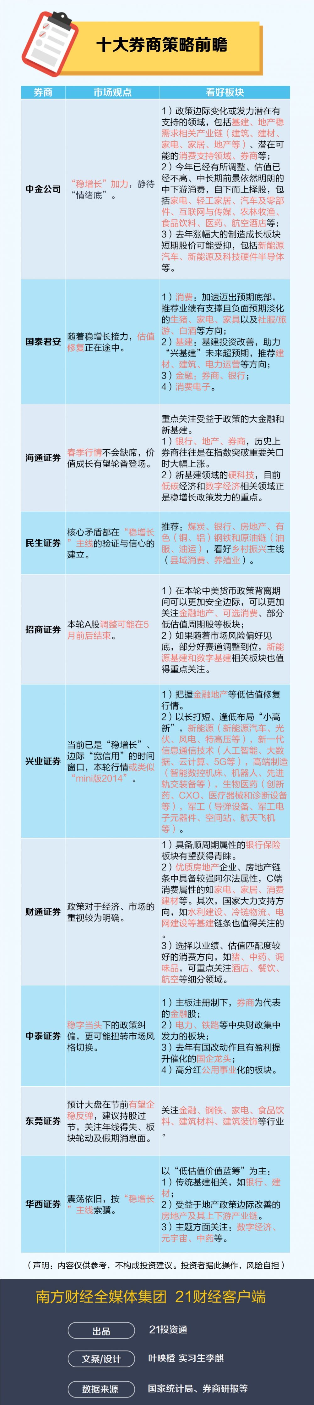 关于后市走势,东莞证券预计大盘在节前有望企稳反弹,建议持股过节,关注年线得失、板块轮动及假期消息面。海通证券认为,春季行情不会缺席,价值成长有望轮番登场。而招商证券则认为本轮A股调整可能在5月前后结束。中金公司亦表示,“稳增长”加力,静待“情绪底”。