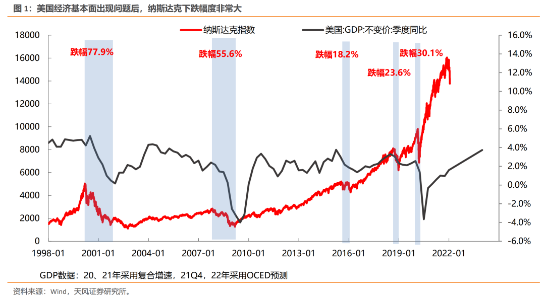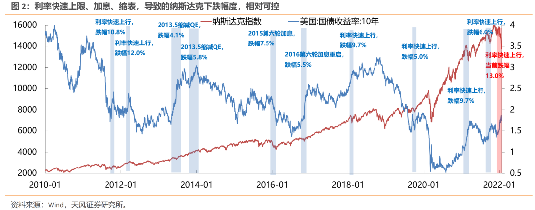 回到当前,如果假设美联储的加息和缩表动作充分考虑了经济的情况,那么第一次加息导致经济崩盘的可能性是比较小的,在这种情况下,目前纳斯达克从高位下跌13%,与此前分母端影响的经验相比,已经幅度不小。