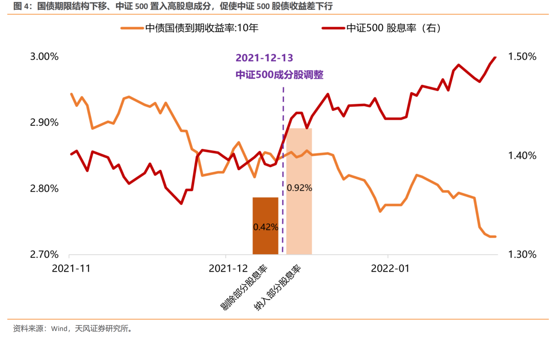(2)现金分红方面,2021年12月13日中证500成分股调整中,50只调出个股股息率为0.42%,50只调入个股股息率为0.92%,此次成分股调整抬升了中证500现金分红中枢水平;