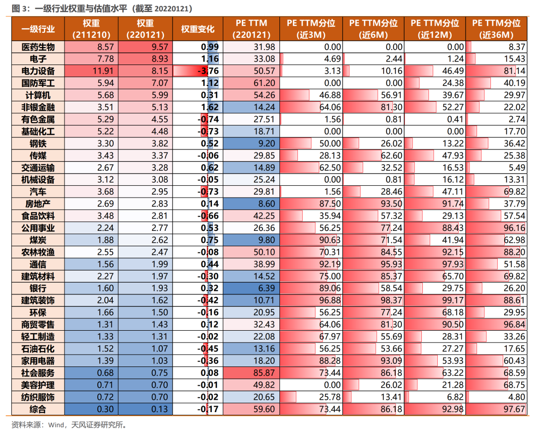 (2)前五大权重行业中其余四行业(医药生物、电子、国防军工、计算机)权重均小幅上调,四行业权重共计上调3.58pct,与电力设备调降幅度(3.76pct)基本相当。