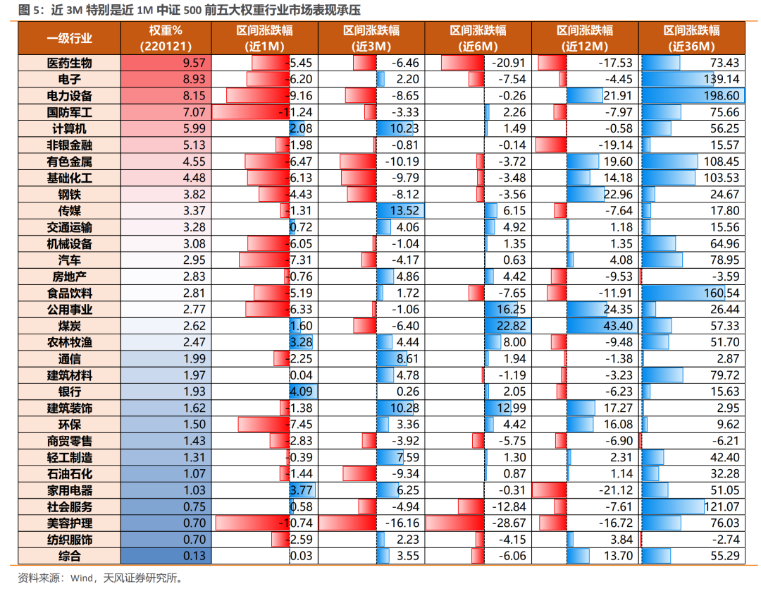 (2)电力设备当前估值水平处于近1Y以来中间水平、近3Y以来较高水平,故从估值角度看可能仍有调整空间,但考虑到其行业权重大幅下修,对中证500的拖累将弱于21M11-M12;