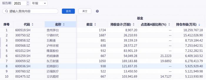 梳理公募基金四季报披露的重仓股,去年四季度末,共有1724只基金重仓持有贵州茅台,合计持股市值达1826亿元;宁德时代紧随其后,共有1687只基金重仓持有,持股市值为1541.2亿元;东方财富在短短一年内,从公募基金重仓持股榜的第十五名跃升至第七名,去年四季度末共有1050只基金重仓持股,持股总市值合计627.8亿元。
