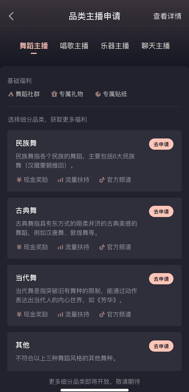 1月25日,抖音直播宣布推出优质主播激励计划,首期投入千万流量、千万现金,助力优质主播发展,弘扬优秀传统文化。目前已经面向民歌、美声、民族乐器、西洋乐器、民族舞、古典舞、当代舞七大内容品类的部分主播开放申请。后续将向更多品类开放。