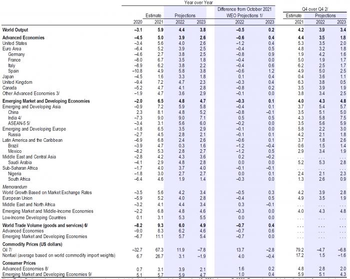 21世纪经济报道记者郑青亭北京报道 供给扰动、通胀上升、债务激增、不确定性增加……随着新冠疫情进入第三个年头,全球经济复苏正在面临多重挑战。1月25日,国际货币基金组织(IMF)在最新一期《世界经济展望》中预测,2022年全球经济增速为4.4%,比三个月前的预测低0.5个百分点,2023年将进一步放缓至3.8%,但比三个月前的预测高0.2个百分点。