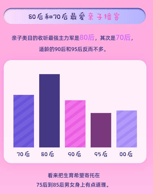 近日,90后00后婚育推迟现象递增以及女性终身不婚的可能性上升等相关话题讨论热度较高,而荔枝App数据似乎也在侧面有所反映。报告显示,荔枝App上,亲子类目的收听最强主力军是80后,其次是70后,适龄的90后和95后反而不多,有专家提出把生育希望寄托在75后到85后男女身上还是有点道理。