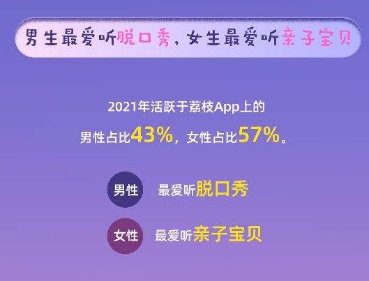在过去的2021年,活跃于荔枝App上的男性占比43%,女性占比57%。从内容喜好来看,男生最爱听脱口秀,女生最爱听亲子宝贝。