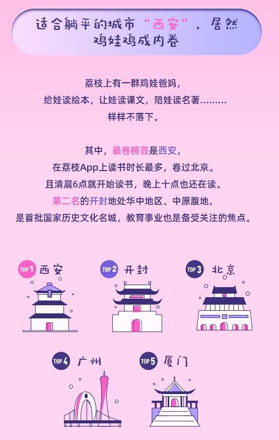 值得注意的是,互联网音频使用人群中,有一群鸡娃爸妈,给娃读绘本,让娃读课文,带娃读名著等等。其中,最卷榜首是西安,在荔枝App上读书时长最多,卷过北京。且清晨6点就开始读书,晚上十点也还在读。第二名的开封地处中原腹地,是首批国家历史文化名城,孩子的教育事业也是备受关注的焦点。