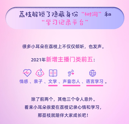 而除了听曲入眠、清晨“定制早安”,荔枝还解锁了隐藏身份“树洞”和“学习记录平台”。在2021年荔枝平台新增主播门类前五中,除了情感和亲子外,文学、声音恋人、语言学习等类别正在显著崛起,疫情之下更多年轻人宅家后,在刷短视频和玩游戏之外,读书学习成为越来越大的刚需,越来越多年轻人开始通过音频来提升自己的能力、进行社交,展现自己的才华。