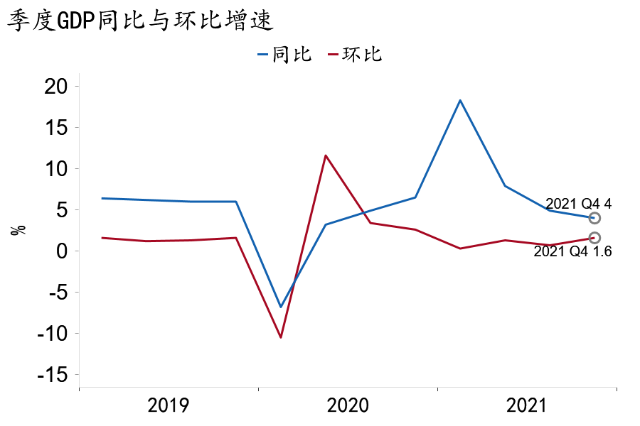 2021年经济保持稳定恢复,但动能前高后低,经济增长压力不断加大。初步核算,2021年我国名义GDP达114.4万亿元,实际GDP增速8.1%,大幅高于政府工作报告中6%的经济增长底线目标。但一至四季度GDP同比增速分别为18.3%、7.9%、4.9%、4.0%,显示经济“稳增长”压力逐季上升。即使考虑基数效应,GDP季度增速的下滑幅度依然超过预期。