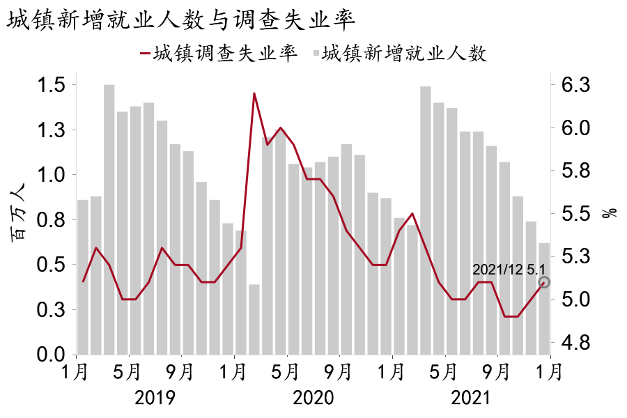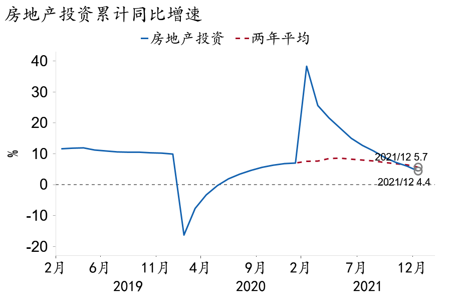经济增长的主要制约因素正逐渐从供给侧向需求侧转移。四季度,随着全球供应链堵塞有所缓解,国内保供政策逐渐起效,供给侧面临的制约明显下降。与此对应,工业增加值增速逐月恢复,12月同比增速回升至4.3%,工业品价格增速自高位趋势性回落。另一方面,需求不足的问题愈发凸显。其中,消费表现持续低迷,受疫情影响12月社会消费品零售总额同比增速下滑至1.7%,全年增长12.5%;固定资产投资整体相对稳定,全年累计同比4.9%,制造业投资是主要支撑,全年累计同比13.5%,但房地产投资持续下滑,累计同比由2020年的7.0%降至4.4%,基建投资尚待发力,全口径累计同比0.2%。