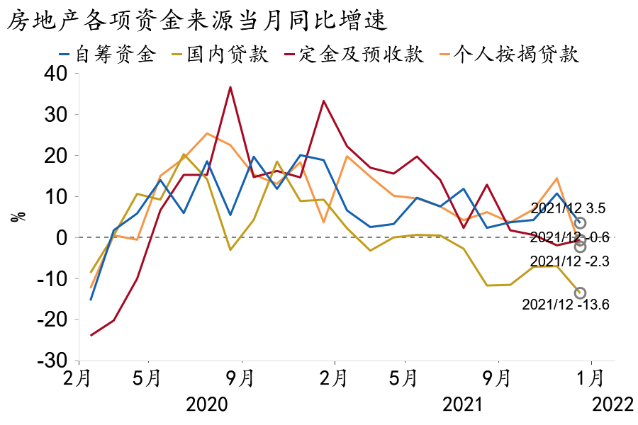 观察房企资金来源,到位资金、自筹资金、国内贷款及个人按揭贷款的两年平均增速均大幅回落。12月房企到位资金两年平均增速-0.9%,较上月下降5.3pct,自筹资金、国内贷款和个人按揭贷款增速分别为3.5%、-13.6%和-0.6%,分别回落7.2pct、6.6pct和16.7pct,仅定金及预收款增速触底微幅回升。