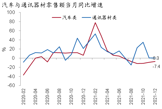 12月工业生产继续回升。规模以上工业增加值同比增速较上月回升0.5pct至4.3%,两年平均增速上行0.4pct至5.8%。其中,上游采矿业增速上升1.1pct至7.3%,或主要受到煤炭保供的推动。电热生产供应业增速回落至7.9%,但高于工业生产整体增速,与历史同期相比也处于较高水平。制造业生产增速回升,同比和两年平均增速分别上升0.9pct和0.4pct至3.8%和5.7%,或主要受到外需的结构性支撑。一方面,专用设备和汽车增速较快回升,计算机、通信和其他电子设备保持高增长,另一方面,通用设备和电器机械及器材增速回落较快。前瞻地看,出口回落叠加内需疲弱的背景下,总需求对供给的牵引作用或进一步减弱,今年工业生产增长动能总体趋弱。但供给约束有望进一步缓解。目前全球“缺芯”已有所缓解,芯片中下游行业的生产和出口已现修复,“双碳”“双控”政策“一刀切”执行纠偏有利于煤炭和制造业生产修复,今年全球产业链内生性修复也将减轻生产资料短缺的压力。