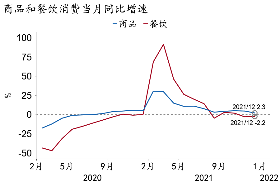 受疫情和“双十一”提前消费影响,12月消费修复动能边际减弱。社会消费品零售总额当月同比增速1.7%,较上月下降2.2pct,环比增速-0.18%,再度落入负区间。商品零售同比增速继续下滑2.5pct至2.3%,而餐饮消费同比增速受低基数影响小幅回升0.5pct至-2.2%。商品消费下滑呈现以下几个特征:一是“双十一”提前消费影响明显,升级类商品零售增速大幅下滑,化妆品、金银珠宝、文化办公用品类增速分别下行5.7pct、5.9pct、10.7pct至2.5%、-0.2%和7.4%;二是房地产相关消费低迷,家用电器、家具和建筑装潢类增速分别下滑12.6pct、9.2pct、5.6pct至-6.0%、-3.1%和7.5%;三是新经济相关品类消费增长放缓,芯片短缺情况缓解,带动汽车行业消费增速继续上升1.6pct至-7.4%,但复苏节奏总体偏缓;通讯器材受去年高基数影响,增速与上月持平于0.3%。