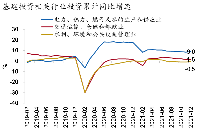 2021年全年基建投资表现不及预期,但年末因财政支出加速而有所回升。1-12月全口径基建投资累计同比增速为0.2%,两年平均为1.8%,较1-11月上升0.2pct,当月投资两年平均增速回升4.9pct至4%。从结构上看,电热燃水业增速小幅回升,交运仓储业增速继续回落,水利环境和公共设施管理业跌幅小幅缩减。