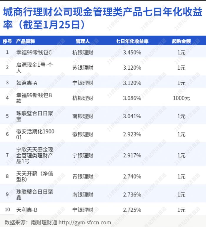 截至1月25日,城商行理财公司现金管理类产品七日年化收益榜有6家理财公司的产品进入前十榜单,分别是杭银理财、苏银理财、宁银理财、南银理财、徽银理财和青银理财。其中,宁银理财上榜3只产品,杭银理财、南银理财均上榜2只产品,其余理财公司各上榜1只产品。