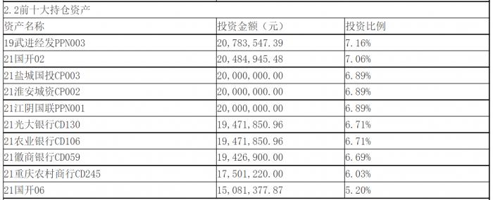 第一大持仓“19武进经发PPN003”投资金额约为0.21亿元,投资比例7.16%;第二大持仓“21国开02”投资金额约为0.21亿元,投资比例7.06%;其后连续三项城投债投资金额相同,均为0.20亿元,各占比6.89%。同时,两项同业存单投资金额也完全一致,约为0.19亿元,各占比6.71%。