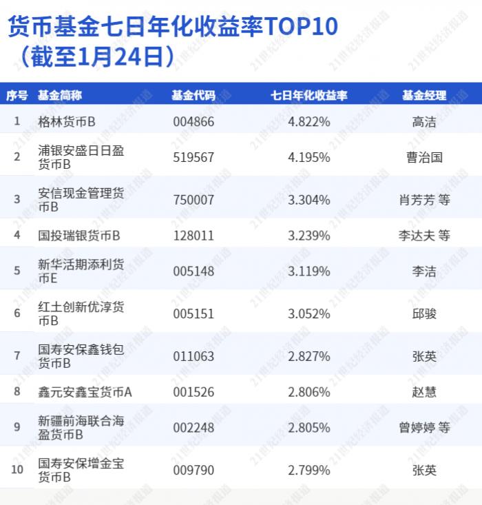 相对而言,货币基金的收益率波动更大。从单只货基表现来看,相比于1月10日我们发布的货基收益榜单,“华夏货币B”曾以7.503%的七日年化收益率高居榜首,截至1月24日,该只货基七日年化收益率仅为1.896%,回归到其长期保持的2%水平。同时,本次榜单排名第一的“格林货币B”曾于1月4日以5.573%的收益水平荣登榜首,现今七日年化收益率为4.822%,虽有所下跌,但依旧占据榜首。