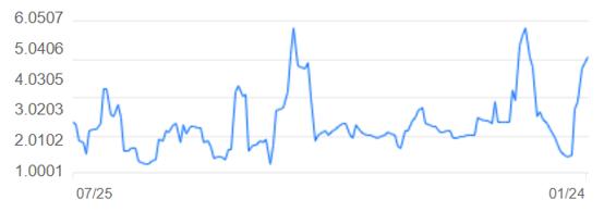 “格林货币B”近6月来七日年化收益率走势变化剧烈,2022年1月17日收益水平跌至1.531%,两日后收益水平超过3%,在短短一周内收益水平达到4.822%,可谓涨势惊人。