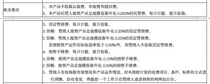 在产品费用方面,该产品不收取认/申购费及赎回费。自2022年1月19日起,杭银理财对该产品提供费率优惠,不再收取销售手续费,C份额固定管理费率由0.25%/年调整为0.10%/年,托管费仍为0.025%/年。此外,若理财资产运作实际收益率低于0.50%/年,则管理人不收取固定管理费。
