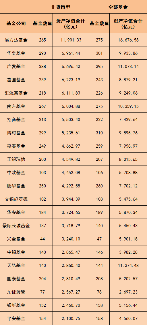 从单家公募基金公司规模来看,截至2021年末,易方达基金非货币型基金资产净值合计1.19万亿元,非货币基金数量265只,位居非货币基金规模第一名,也是唯一一家非货币基金规模破万亿的基金公司。