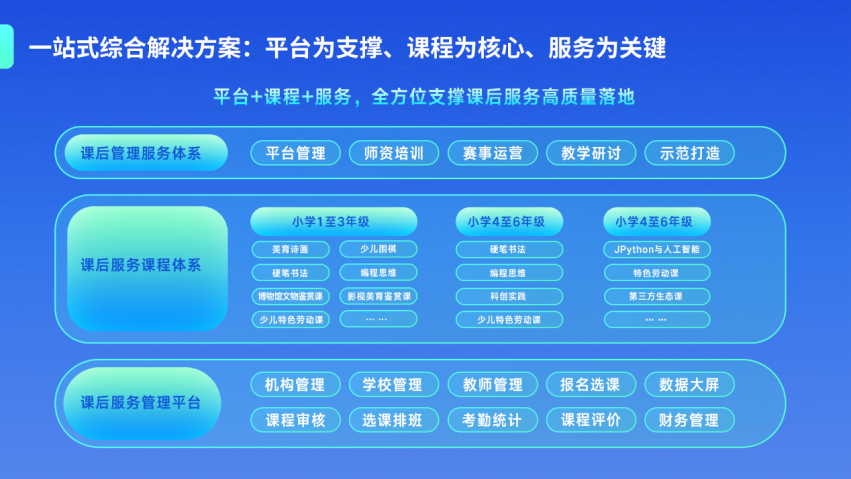 此外,针对课后服务场景,“平台+课程+服务”一站式综合解决方案大有填补教培缺位空白的趋势。一起教育科技、掌门教育、网易有道等企业,都基于作业+课后多层次进行布局。目前,教育行业的B端进击之路上,“平台+课程+服务”被技术串联,一站式的体系更加被重视。可以说,B端的抢滩战役已经打响。