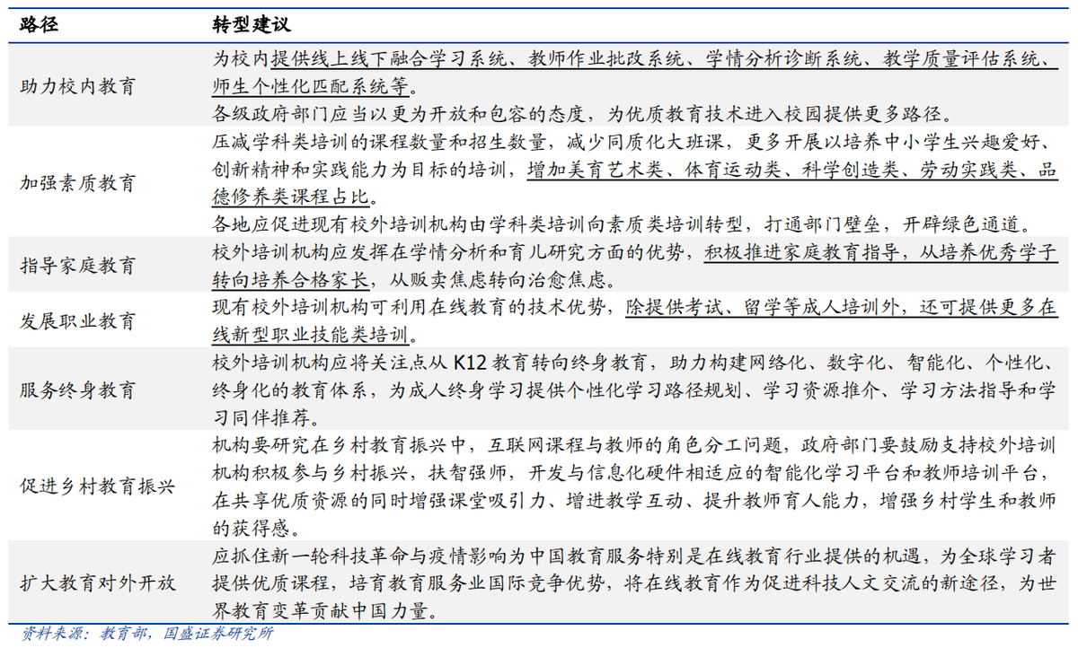 教育部于2021年8 月16 日在官网刊登了《校外培训机构转型路子多》一文,为学科类K12 培训机构指明的转型路径,全部是围绕教育行业进行的:助力校内教育、加强素质教育、指导家庭教育、发展职业教育、服务终身教育、促进乡村教育振兴、扩大教育对外开放。这表明政策层面也更加鼓励教育行业企业充分利用好前期积累的资源和优势,实现流畅的转型。