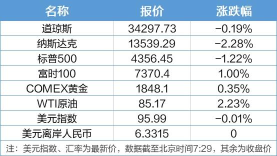 3、美股全线下跌,道指跌0.19%,标普500指数跌1.22%,纳指跌2.28%。盘中道指一度跌超2%,纳指跌超3%。欧股集体上涨,德国DAX指数涨0.75%,法国CAC40指数涨0.74%,英国富时100指数涨1.02%。