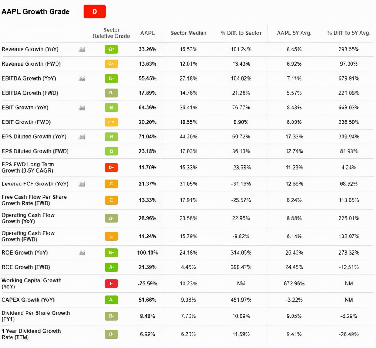 在这一点上,糟糕的营运资本增长上该股与大多数科技ETF的保持一致。由于年度营运资本增长为F级,Apple对研发 (R&D) 的资较少,这对未来来说并不是一个好兆头。每当一家公司停止或开始撤回对研发的投资时,通常情况下,他们已经进入成熟周期的后期阶段,这表明未来增长可能会放缓,因此他们的长期增长预期会更低。