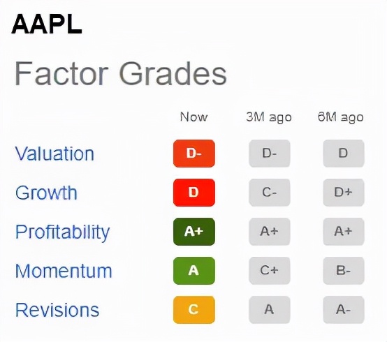 整体量化评级不是因素等级的简单平均。为了最大化量化评级的预测价值,某些因素的权重高于其他因素。如果一只股票在一个因素上得分非常低,则它被取消资格,因为它高于中性(持有)。不合格等级是增长、动量和每股收益修正的D+ 或更差,以及价值和盈利能力的 D- 或更差。就苹果而言,该股票的估值为F级,增长为D级。基础指标的所有等级的评分不均等。
