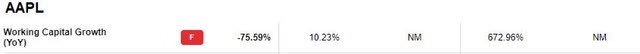 营运资金对公司的成长至关重要,因为它是可用于满足当前和短期承诺的资金。营运资金比率衡量公司的财务状况,公司的营运资金越高,它的运作效率就越高。营运资金按流动资产/流动负债计算。2:1的营运资金比率通常被认为是健康的。下面对Apple营运资本增长的回顾显示为-75.59%,被评为F级。营运资本增长不佳表明公司运营效率不高,也没有对其未来进行投资。