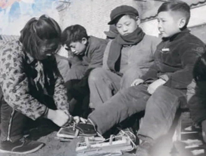 上世纪50年代,孩子们在穿木板冰鞋。(图源:北京日报)