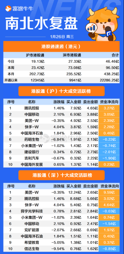 1月26日(周三),南向资金净买入46.46亿港元,连续16日净买入,累计净买入454亿元。美团-W、快手-W、腾讯控股分别获净买入11.98亿港元、6.92亿港元、6.3亿港元。净卖出方面,建设银行、吉利汽车、信达生物分别遭净卖出2.01亿港元、1.9亿港元、0.85亿港元。