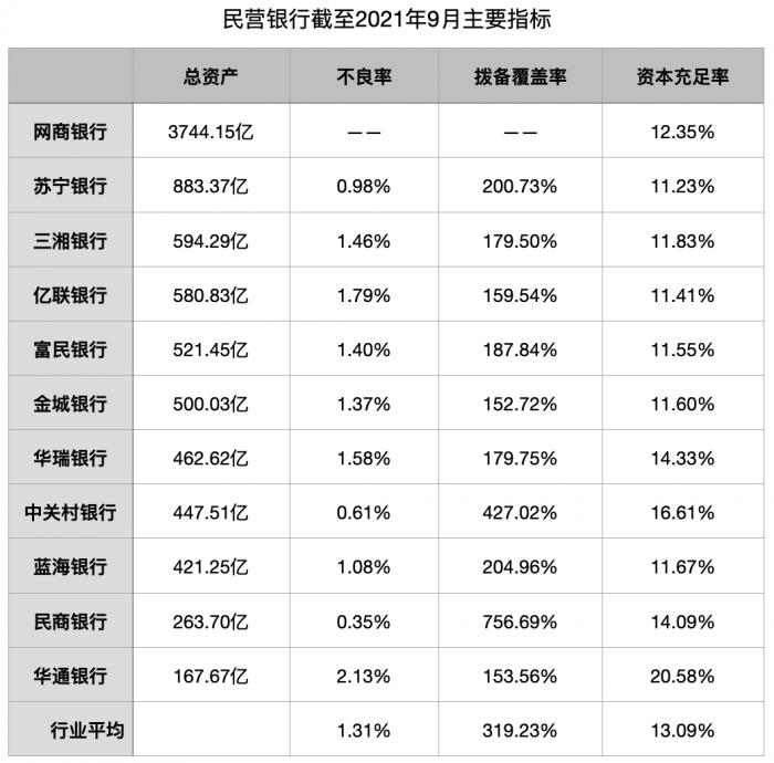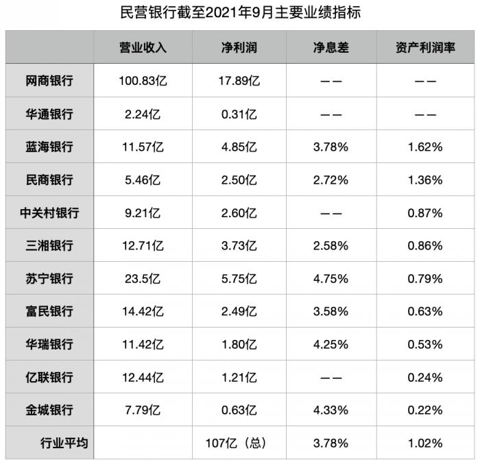 以下为其他11家披露了截至2021年前9个月各项指标情况的民营银行