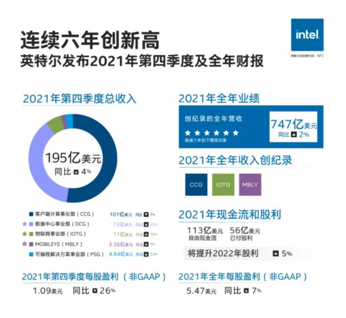 1月27日,英特尔发布了2021财年Q4季度和全年财报。去年,英特尔收入达到747亿美元,同比增长2%,再次创下营收新纪录;净利润为224亿美元,较上年同期增长4%。在第四季度中,英特尔总收入195亿美元,同比增长4%;净利润45亿美元,同比下降27%。