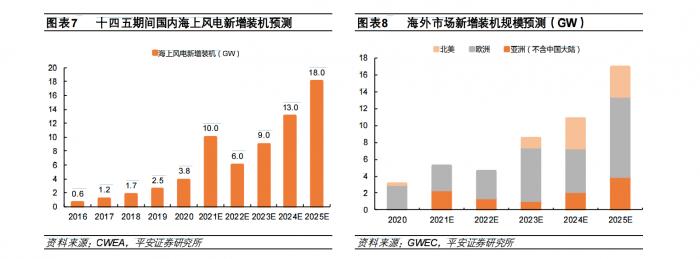 其中,预期十四五期间国内海上风电新增装机约56GW,年均约11GW;十五五期间海上风电新增装机约140GW,年均28GW。