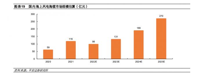平安证券认为,海上风电离岸化是趋势,未来海上风电海缆的规模有望提升。离岸距离的增大将增加送出海缆的需求。假设2025年国内海上风电项目平均离岸距离40-50公里,2025年国内海上风电新增装机有望达到18GW,按照单位千瓦的海缆造价超过1500元估算,则对应的海缆需求有望达到270亿元以上,较2021年110-120亿元的国内海上风电海缆市场规模明显增长。