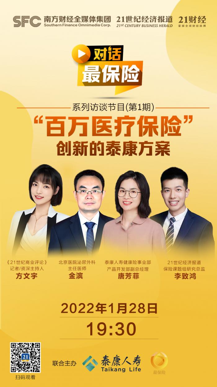 《21世纪经济报道》保险课题组持续关注行业发展,于近期推出重磅策划保险类访谈节目《对话·最保险》,节目主要围绕保险领域的相关话题,与保险领域专业人士展开深入讨论。首期节目我们将邀请北京医院泌尿外科主任医师金滨、《21世纪经济报道》保险课题组研究总监李致鸿及泰康人寿健康险事业部产品开发部副总经理唐芳菲共同探讨特需医疗保障、长期医疗险等话题,为广大观众答疑解惑。