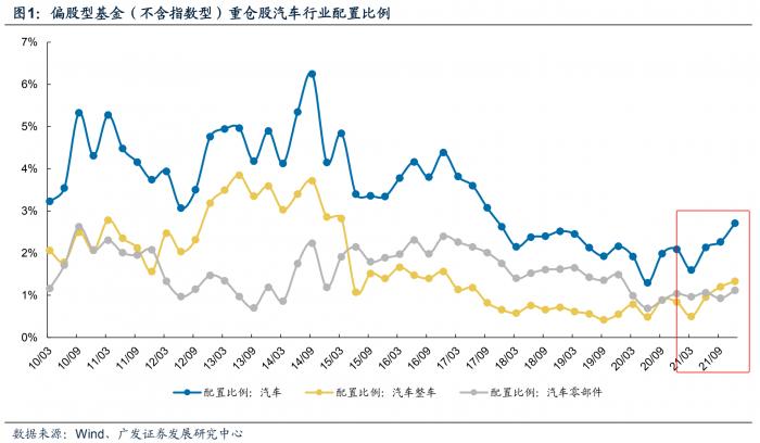 根据Wind统计,2021年4季度末汽车行业公募基金配置比例为2.71%,环比上升0.44个百分点,但仍处于低配状态。汽车行业公募基金配置比例的高点为2014年3季度末的6.3%,此后大体上处于下滑趋势(尤其是整车板块),2015年3季度末至16年年底配置比例由3.3%上升至4.4%,主要与上一轮购置税优惠刺激政策有关。